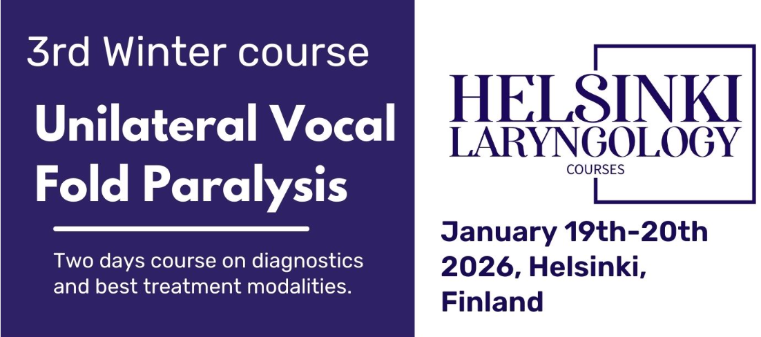 3rd Winter Course - Unilateral Vocal Fold Paralysis Dates: 19th - 20th January, 2026, Helsinki, Finland Website: https://helsinkilaryngologycourses.com/winter-laryngology-course/ Helsinki Laryngology Courses invites you to its Winter Laryngology Course, which has a comprehensive and intensive program designed to address the diagnostics and management of Unilateral Vocal Fold Paralysis. Registration will be open by 20.8 with limited places.