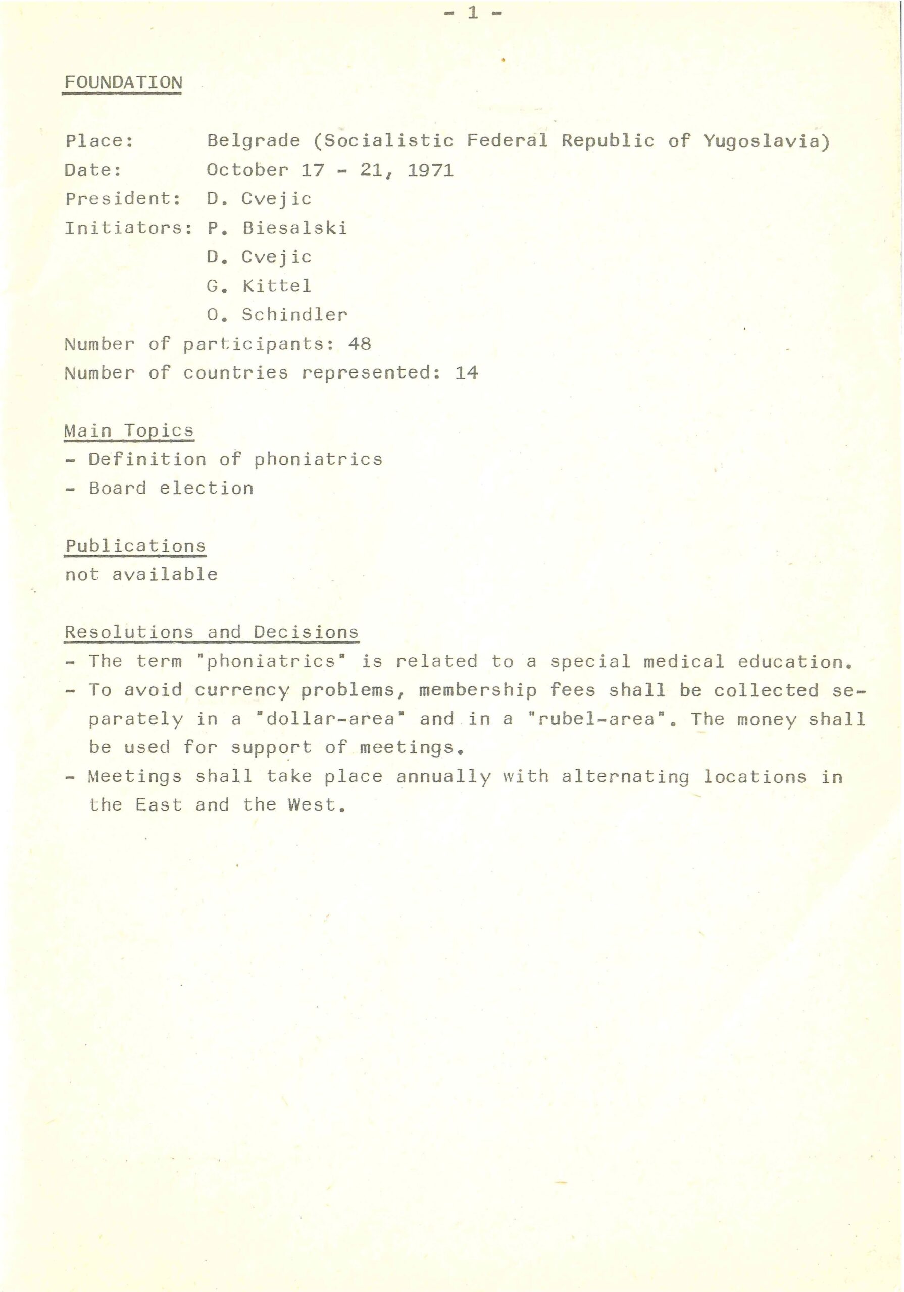 Peter Biesalski (Germany), Dušan Cvejić (Yugoslavia), Gerhard Kittel (Germany), and Oskar Schindler (Italy) founded the Union of the European Phoniatricians in Belgrade, Yugoslavia, in 1971.
